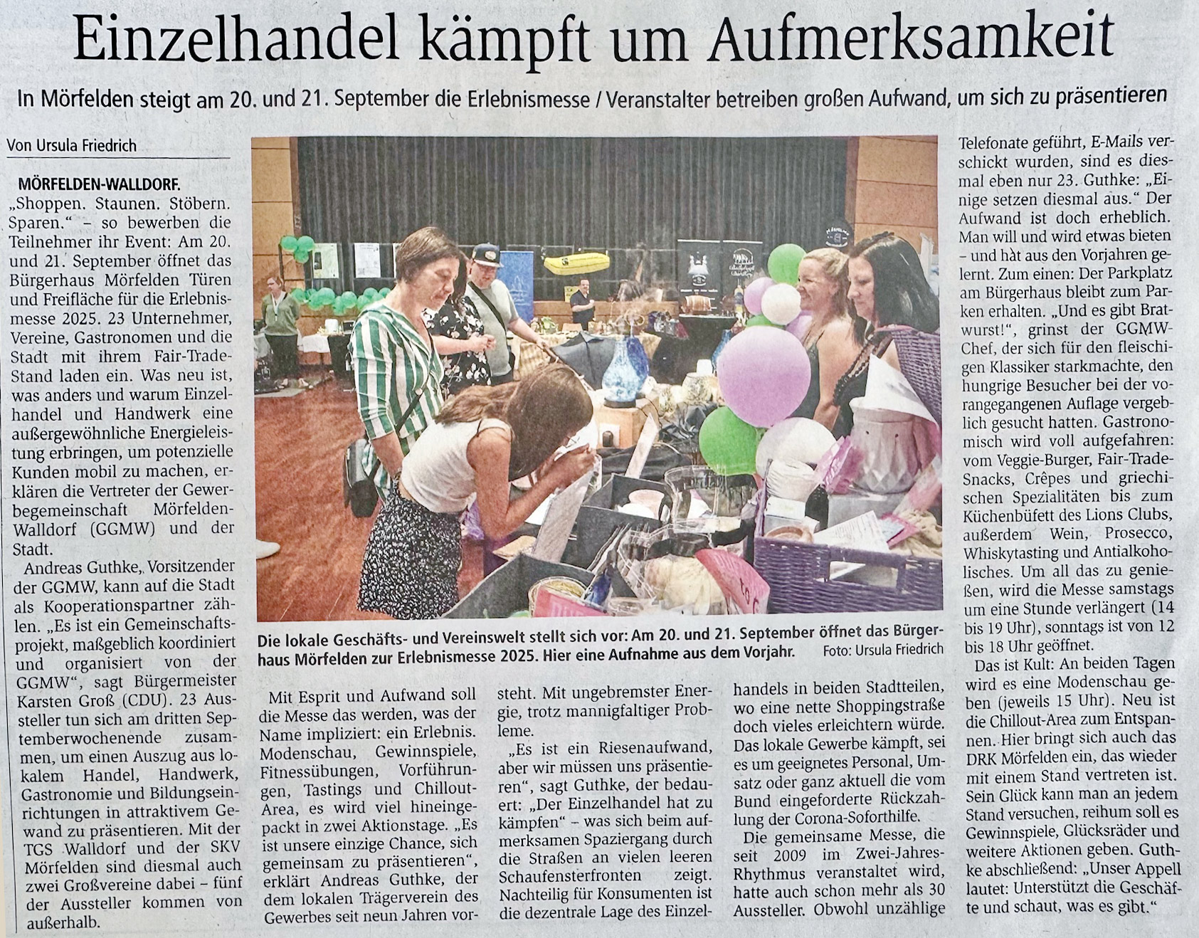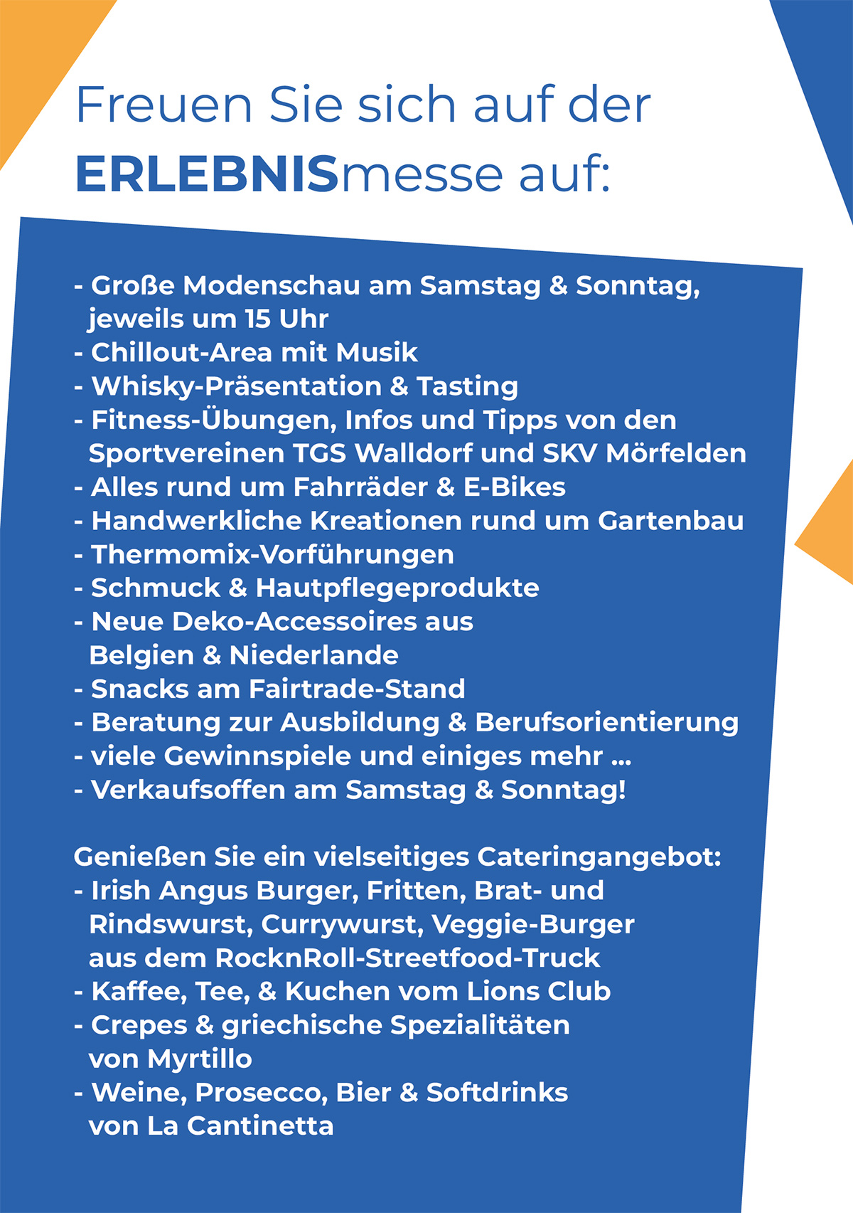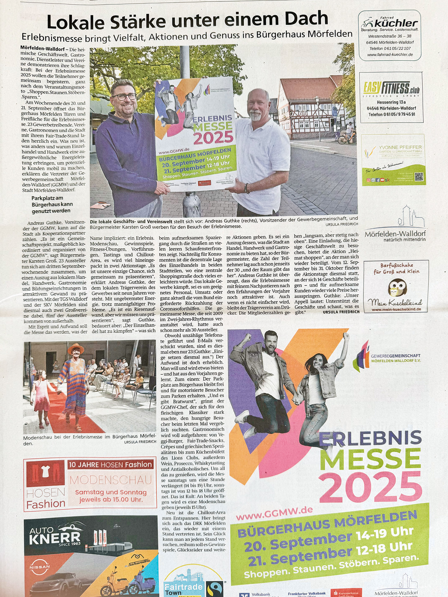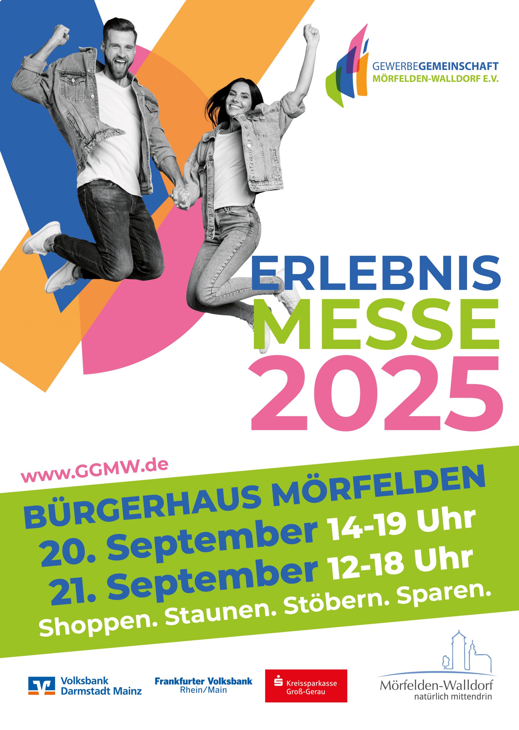 Die Gewerbegemeinschaft Mörfelden-Walldorf veranstaltet mit Unterstützung der Stadt Mörfelden-Walldorf die ERLEBNISMESSE am 20. & 21. September 2025 im und am Bürgerhaus in Mörfelden.