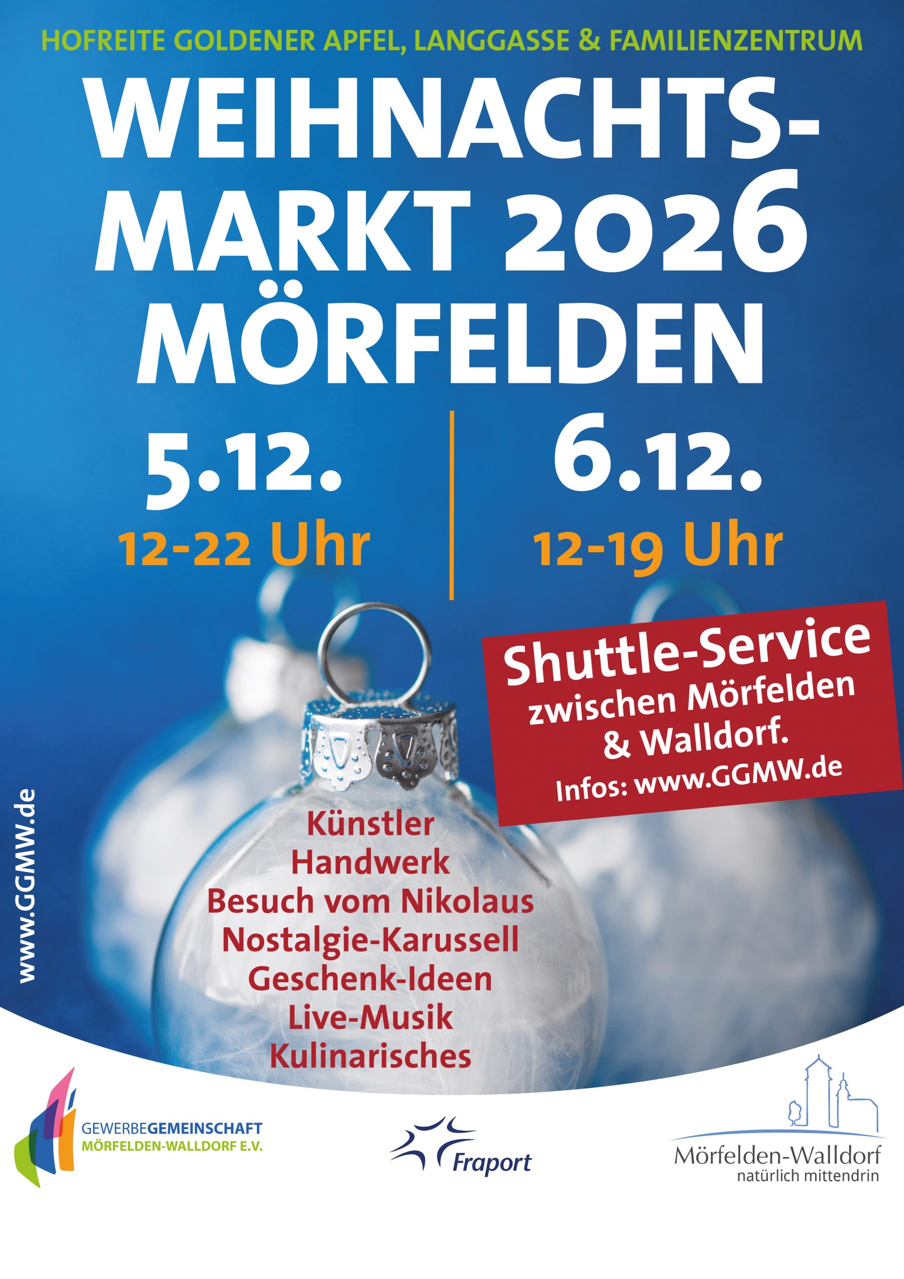 Der Vorstand der Gewerbegemeinschaft Mörfelden-Walldorf hat in Absprache mit Bürgermeister Karsten Groß vereinbart, den Weihnachtsmarkt 2026 erneut im Stadtteil Mörfelden umzusetzen.